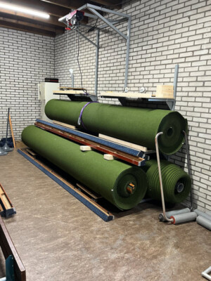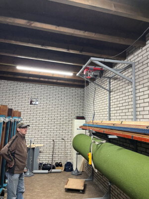 Bowls spelen we op speciale matten van 4 meter breed en 30 meter lang, die rollen we voor aanvang van de wedstrijden uit en na afloop weer op. Om deze matten die ongeveer 250 kg wegen te verplaatsen en vervolgens op te bergen gebruiken we speciale hulpmiddelen. Op onderstaande foto’s zie je enkele leden van onze vereniging in actie bij de montage van het speciaal voor ons ontworpen rek. Met een katrol worden daar de matten eenvoudig en veilig in het rek geplaatst.