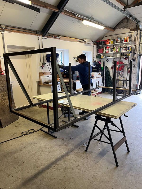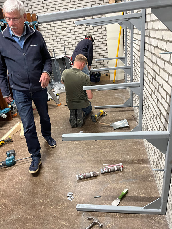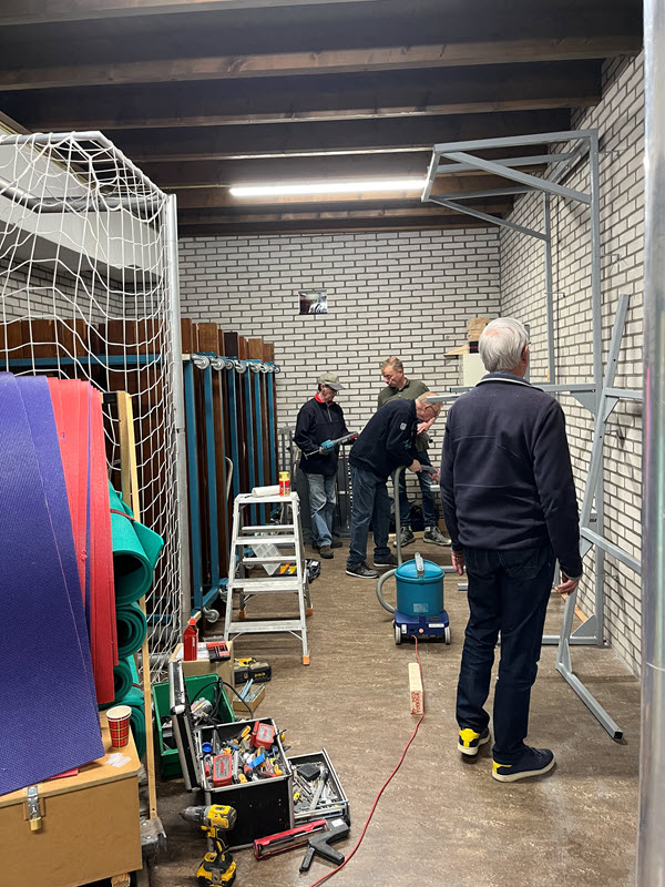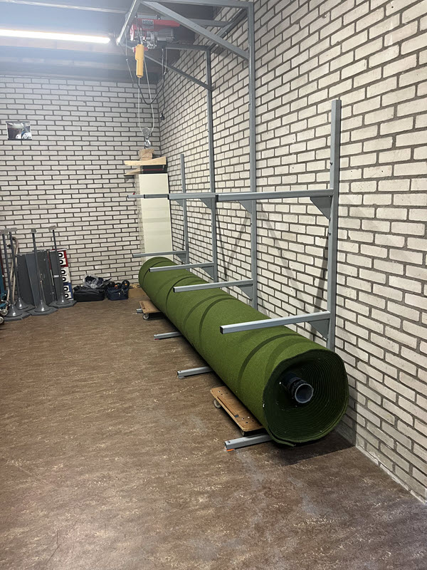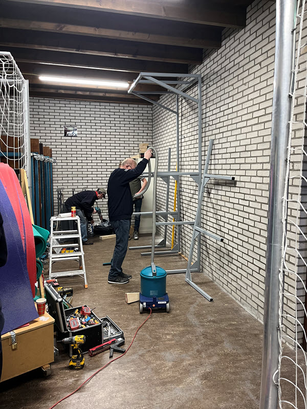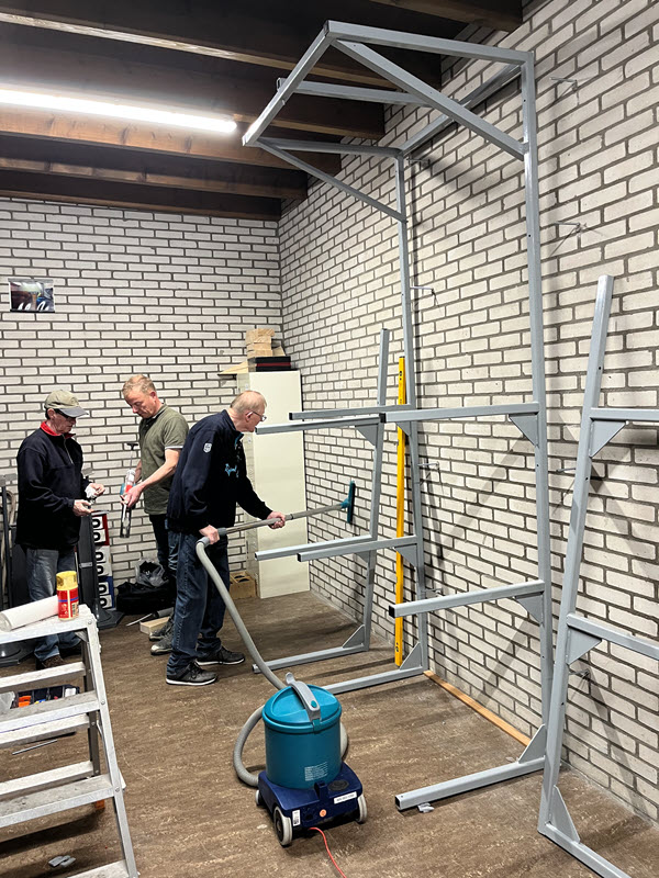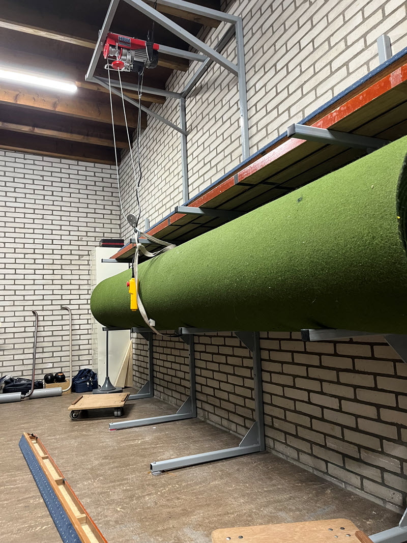 Bowls spelen we op speciale matten van 4 meter breed en 30 meter lang, die rollen we voor aanvang van de wedstrijden uit en na afloop weer op. Om deze matten die ongeveer 250 kg wegen te verplaatsen en vervolgens op te bergen gebruiken we speciale hulpmiddelen. Op onderstaande foto’s zie je enkele leden van onze vereniging in actie bij de montage van het speciaal voor ons ontworpen rek. Met een katrol worden daar de matten eenvoudig en veilig in het rek geplaatst.